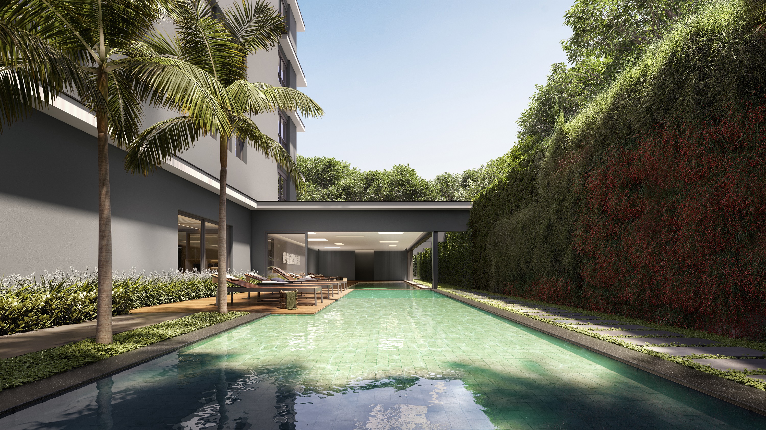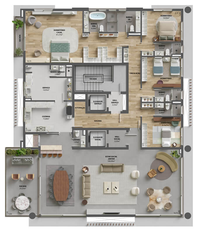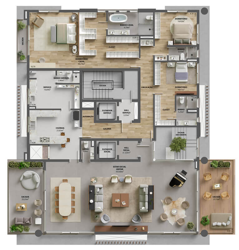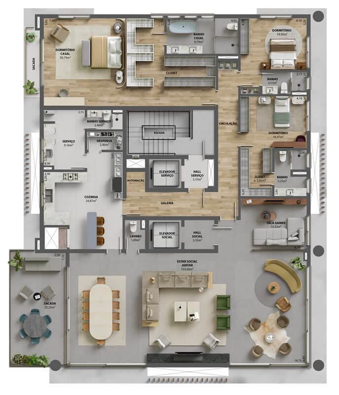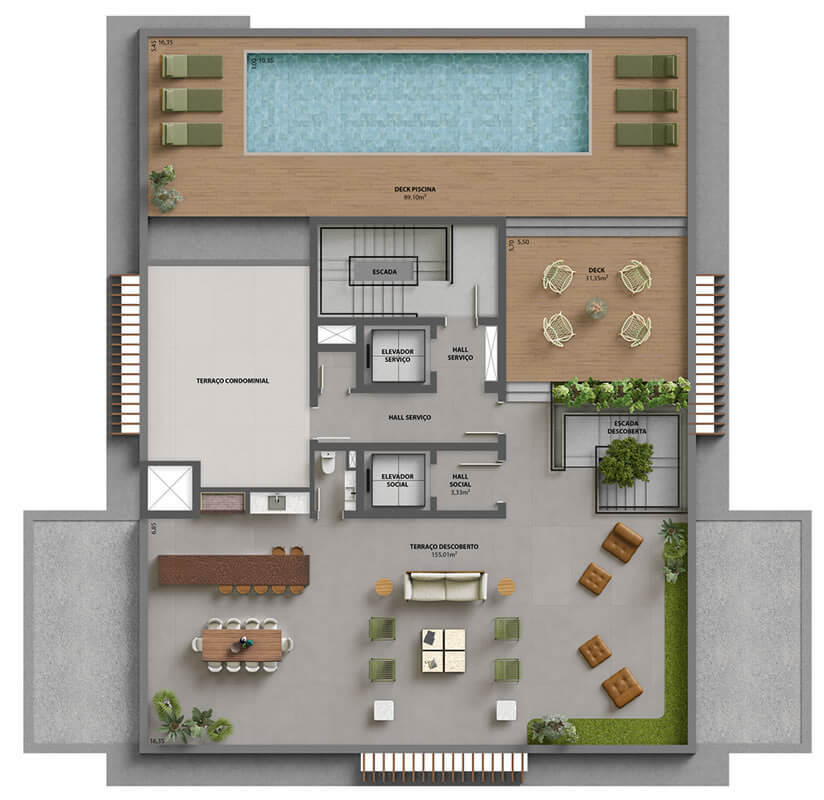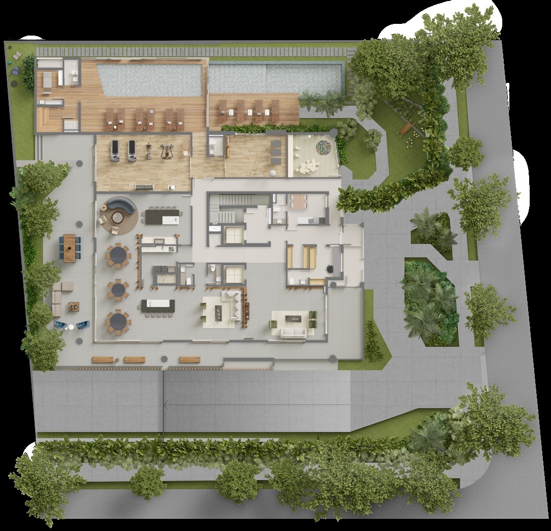 • Apartamentos garden: Unidades no térreo com 575,03 m² de área privativa, incluindo terraço com piscina privativa.